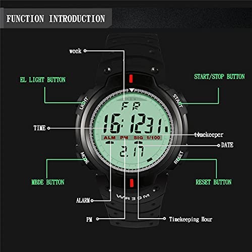 - Multifuctional Sport Watch: featuring 12/24 hour format, hourly chime, alarm clock, calendar with week/date/month, 1/100 Chronograph with Split Function, Luminous hands and EL backlight